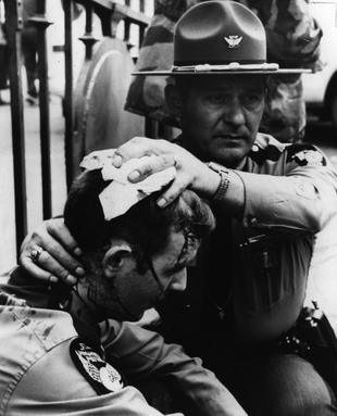 Lieutenant G. J. Forbes comforts Patrolman D. L. Wolfel during a 1970 Campus Riot